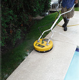 We use professional surface cleaners that use heated water to evenly clean the surface without having to resort to high pressure streams which can severely damage some types of pool decks and coverings.